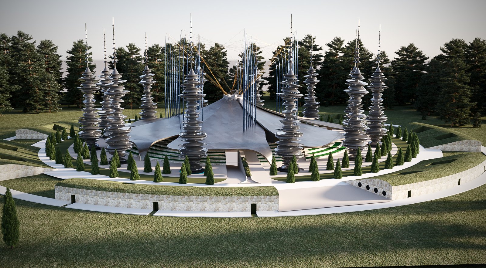 Why address individual physical issues when you can act on the whole system? The large facility designed by Fabrizio Smania answers this question. Incorporating cutting-edge technologies aimed at cellular-level rebalancing, the futuristic structure consists of a central web-like core surrounded by twelve perimeter antennas. This project follows a rigorous technical and scientific approach to create a healing pathway through resonance synchronization.
